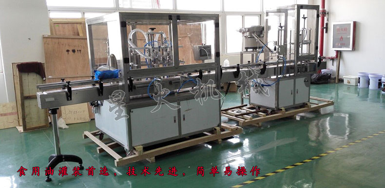 這款食用油灌裝生產線是我司較新研制的灌裝生產線設備,是由四頭灌裝機、自動旋蓋機、貼標機、噴碼機等相關的配套設備組成完善的高效的生產線,是針對食用油類的液體物料灌裝生產所研究設計的組合方案,廣泛適用灌裝于各種油類,如大豆油、潤滑油、食用油、桶裝酒等各個產品及行業(yè)需求中,為液體產品行業(yè)的發(fā)展向前推進一步。以下圖中就是客戶車間使用食用油灌裝生產線的大致情況