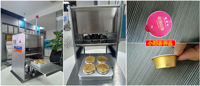 小罐茶鋁罐封口機(jī)為臺(tái)式手動(dòng)封口機(jī),需要人工放入裝好產(chǎn)品的鋁罐到模具內(nèi),人工推入鋁罐到封口切膜裝置下,人工壓下手柄封口和切膜,松開(kāi)后拉出模具取出封好的鋁罐,此時(shí)自動(dòng)收集廢膜;通過(guò)溫控儀控制熱合溫度,人工控制熱合時(shí)間,光電傳感器控制封口膜位置,實(shí)現(xiàn)鋁罐的半自動(dòng)封口。